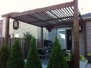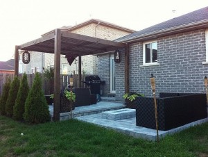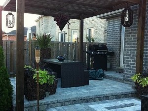Outdoor landscaping project including a 2 level interlock patio and stained pergola with outdoor fabric curtains.